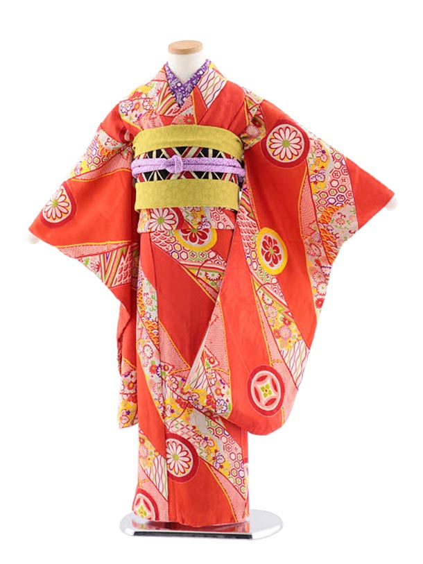 七五三レンタル(7歳女児袋帯) アンティーク 7759 オレンジ 丸紋 四つ身 753 子ども お祝い着 正月 7歳 7才 七才 七歳 女児 7歳着物 フルセットレンタル 7歳着物フルセット きものレンタル 新品足袋プレゼント 往復送料無料【レンタル】