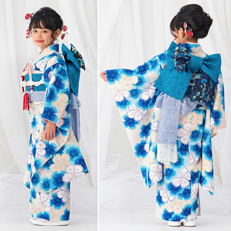 【七五三早割★ポイント10倍】 七五三 着物 7歳 女の子 フルセット 四つ身 753 七歳 7才 子供 キッズ 四ツ身 セット 着物セット 七五三参り お正月 雛祭り 和服 きもの 結び帯 箱せこ 前撮り 販売 購入 モダン 青 白 撫子